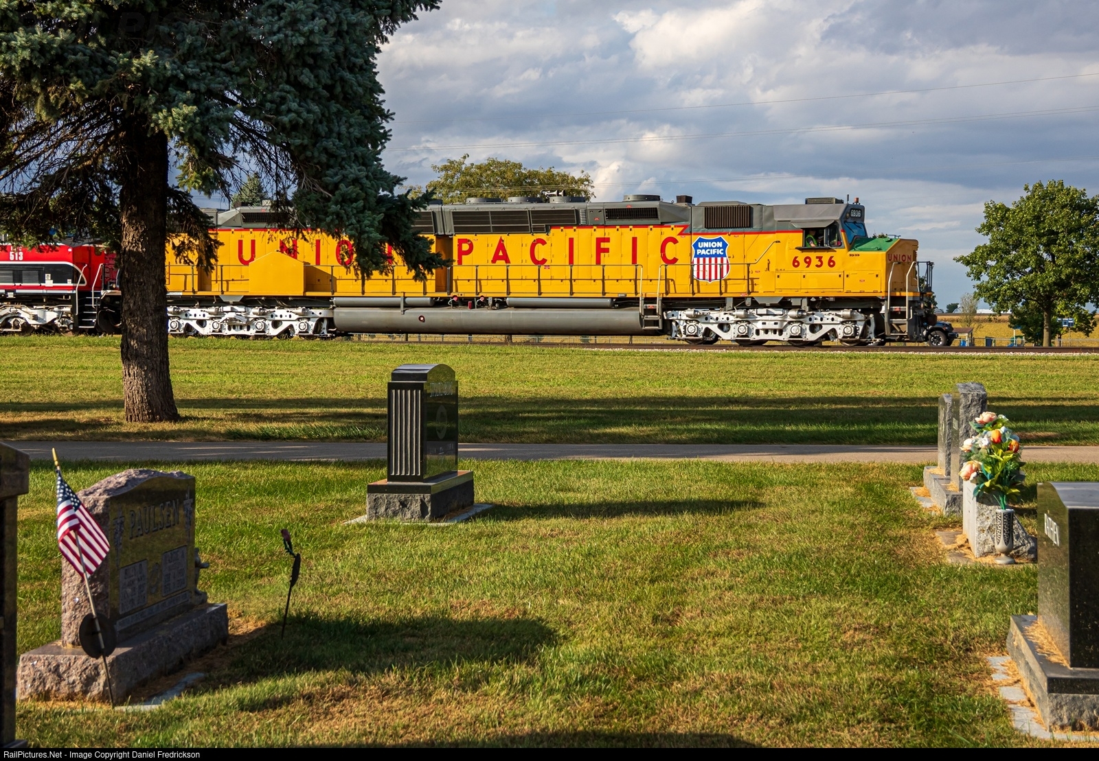 The Railroading Heritage of Midwest America organization operated two days of excursions with restored DDA40X "Centennial" locomotive #6936, with Iowa Interstate providing ES44AC #513 for backup. The trainset operated one round trip per day - west towards South Amana, IA on 9/20 and east to Bureau Junction, IL on 9/21, both trips originating in Silvis, IL. Here, the South Amana train thunders eastbound back to Silvis, passing a cemetery on the east side of Durant, IA.