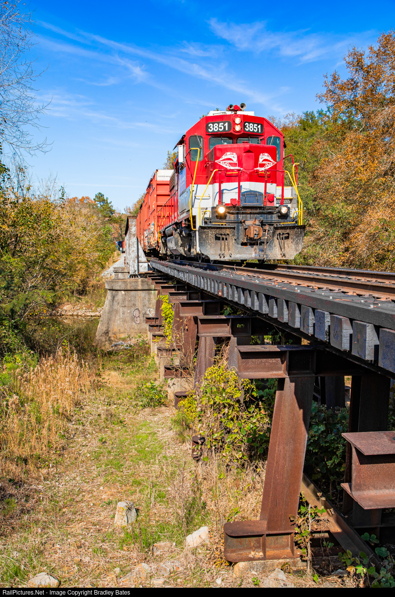| RJC GP38-2 #3851 pulls a cut of cars across Talladega Creek at Coosa Pines on their way to be interchanged to Norfolk Southern at Childersburg, AL. |