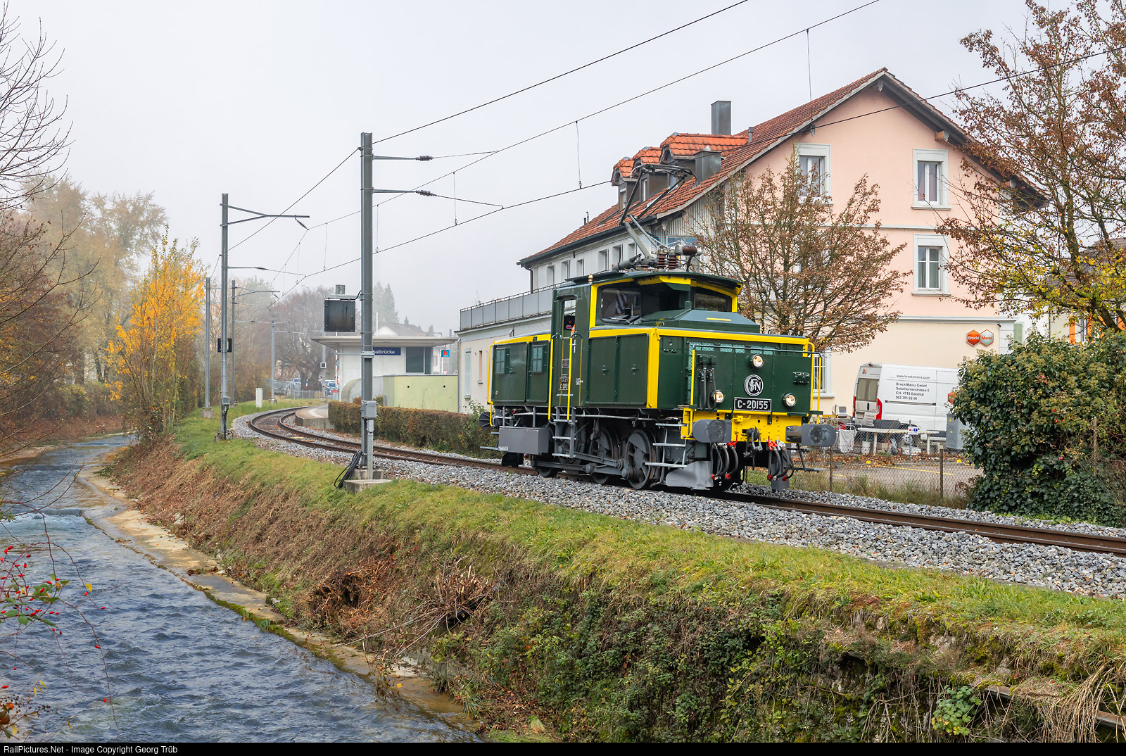 | Electric shunting locomotive C # 20155, privately owned by the association “Team C-20155” in Balsthal, between Thalbrücke and Klus during cab rides. This locomotive for 25000 V 50 Hz and 15000 V 16.7 Hz AC was built in 1962 by SLM and SAAS in a series of 9 units to the french SNCF for freight traffic between the French freight yard St-Louis (near Basel) and the shunting yard Muttenz in Basel. At that time, they were always used in pairs in multiple control. After being replaced by new two-system locomotives, the 9 locomotives were sold to the SBB in 1971/72 and used as Ee 3/3 II # 16511 to # 16519. The Ee 3/3 II # 16515 was discarded in 2000 and purchased by a member of the newly founded association. It has now been largely restored to its condition as SNCF C # 20155. |
