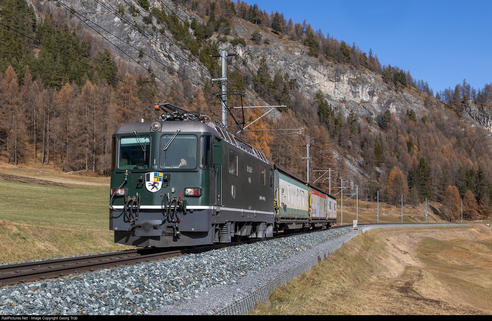 | The green Ge 4/4 II # 611 "Malans" pulls the diverted freight train 7129 from Chur freight yard via Landquart-Klosters-Zernez to Samedan, between Madulain and La Punt Chamues-ch. The train ran via the Vereina line due to engineering works on the Albula line. |