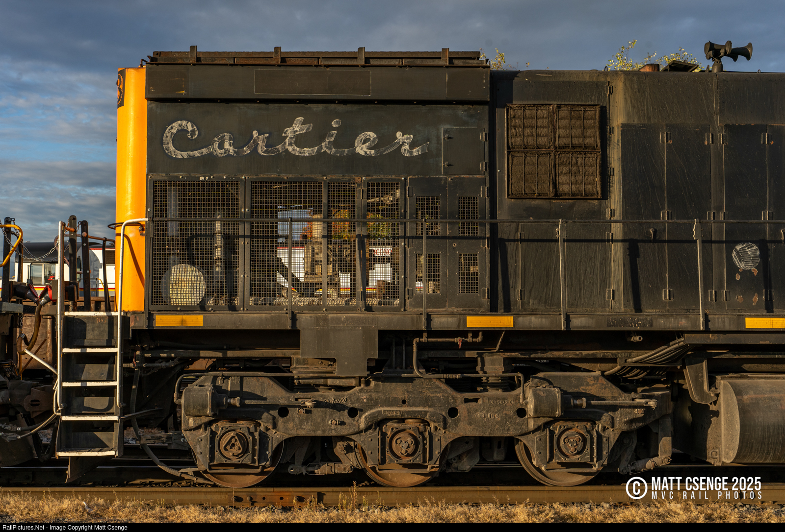 The long hood of Delaware-Lackawanna M636 no. 3602 still features the script logo of its former owner, the Cartier Railway. Formerly owned by the Québec Cartier Mining Company - now a subsidiary of Arcelor Mittal - the railway operates 260 miles of track in Northeastern Quebec, completely isolated from the rest of the North American network. The locomotive was built by the Montreal Locomotive Works (MLW) in 1970 as Canadian National 2302. |