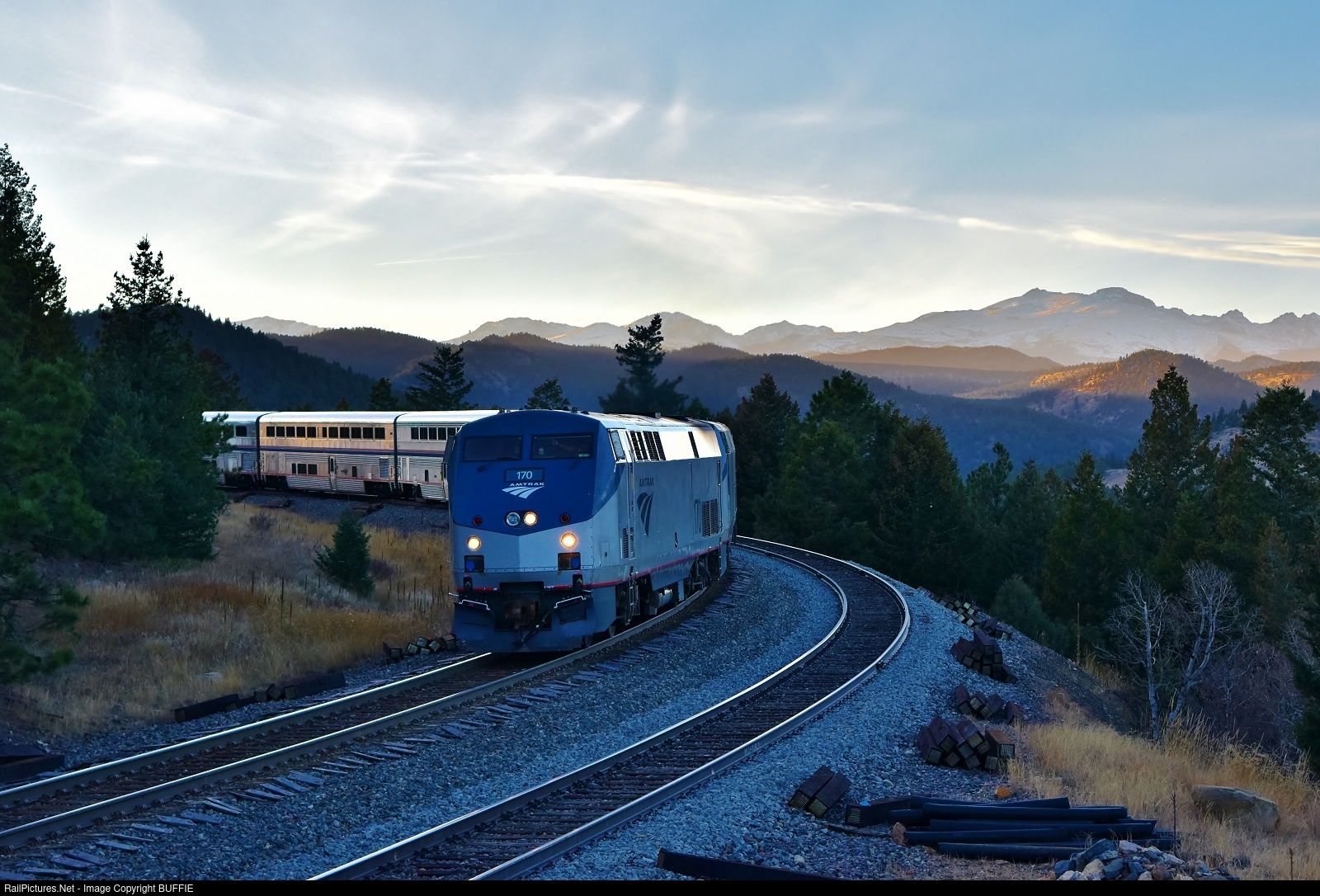 | High winds above the Continental Divide whip the clouds as the evening blue hour begins to take hold at Crescent, Colorado. Amtrak engine #170 (P42DC) leads the California Zephyr #6 train as it runs east on the Moffat Tunnel Sub. |