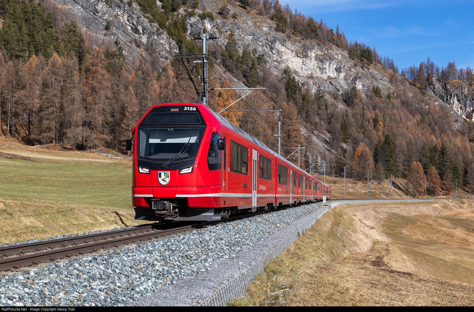 | "Capricorn" trains ABe 4/16 # 3156 and # 3146 of the Rhaetian Railway in multiple control are running the RE 1031-1331 of the line RE3 from Landquart via Klosters-Vereina-Zernez to Samedan-St.Moritz, between Madulain and La Punt Chamues-ch. |