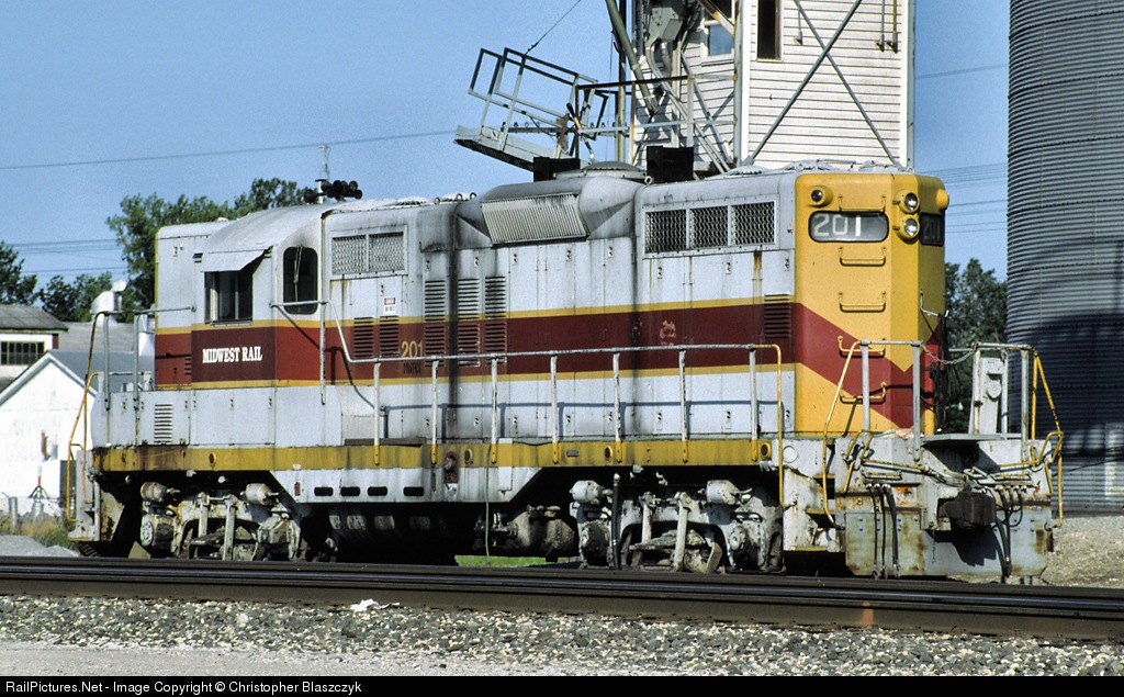 | Midwest Rail 201, a GP9, is seen sitting in front of a grain complex along the BNSF transcon. This engine started life on the Rio Grande and then was leased to the South Orient Railroad. It still wears its South Orient paint and number today. |