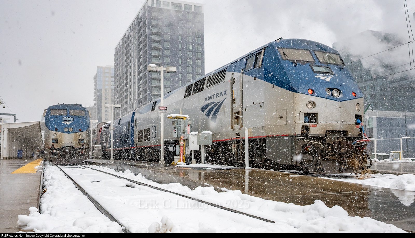 Winter storm warning has just moved in over the Mile High City, both Winter Park Express and 5 wait impatiently for departure for the days parade west in the Moffat. |