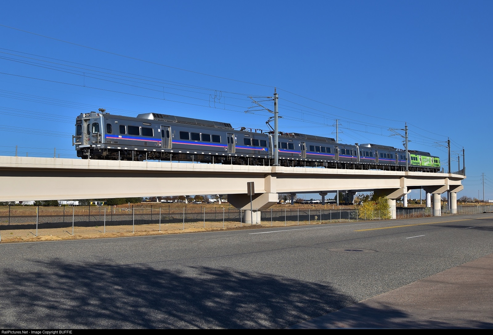 | RTD of Denver's commuter train to Denver International Airport runs the elevate track in Aurora, Colorado.