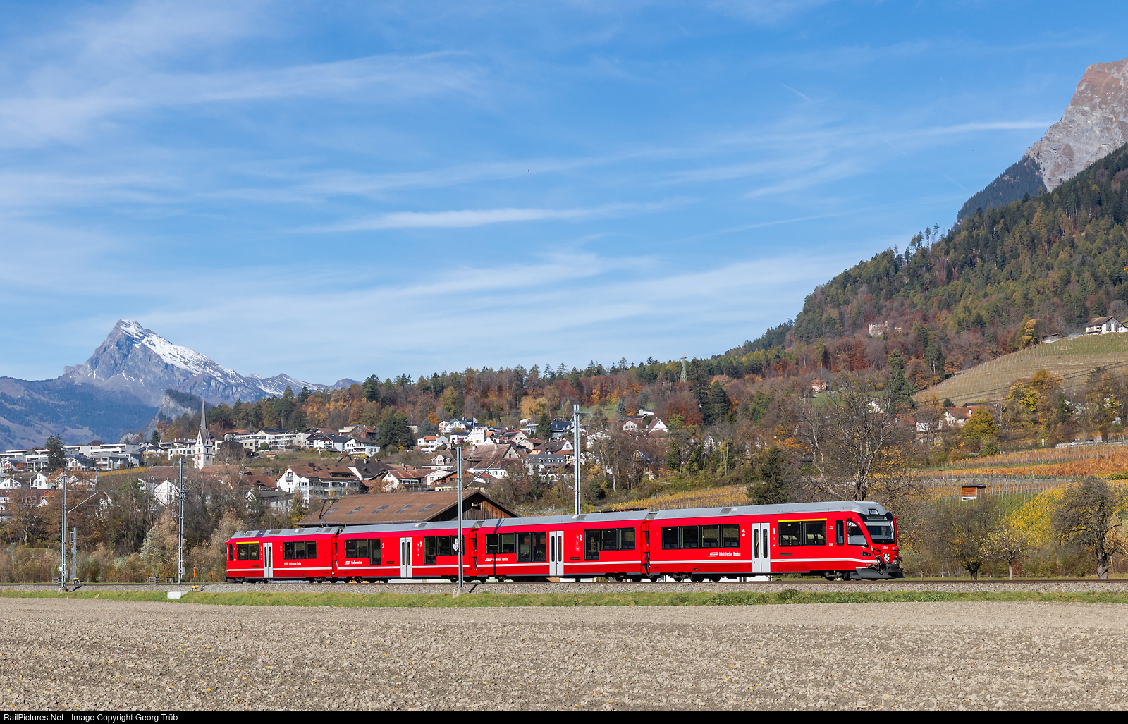 | "STZ" (Stammnetz Triebzug) ABe 4/16 # 3101 of the Rhaetian Railway is running the S2 service 1513 from Schiers via Landquart-Chur to Rhäzüns, between Seewis-Valzeina and Malans, with the Gauschla mountain in the background. The RhB has 5 of this "commuter trains" for the main network (11000 V 16,7 Hz), similar to the Allegra "ZTZ" (Zweispannungs Triebzug). |