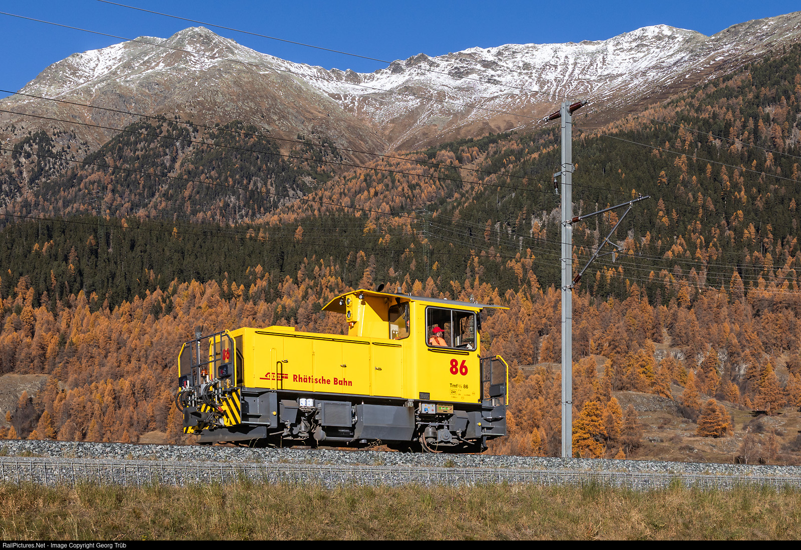 | The "tractor" (small diesel locomotive) Tmf 2/2 # 86 of the Rhaetian Railway, built in 1991 by RACO and rebuilt in 2021, is running as train 9943 from Zernez to Samedan, probably for driver training. |