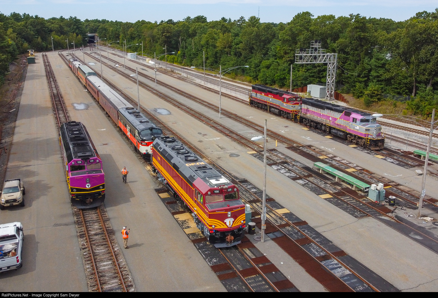 Family Portrait MBTA F40PH-3C #1030 is posed up in the Middleboro Layover Yard with the New England Railroad Club's annual Dinner Train. This year, both of Cape Cod Central's New Haven FL9s are making the trip up to Boston, capped by an ACSES-equipped F40 on either end. This is 1030's debut in its new heritage paint scheme, paying homage to the Boston and Maine, the railroad which the T inherited its north side lines from. Off to the right sit two GP40MCs, one of which is the MBTA's first heritage unit, "the Cranberry," which also originally came about as a result of the Boston and Maine Railroad. Both of these geeps are bound for the Wareham contractor shops, where they'll receive heavy repairs. In the near future, more GP40MCs will debut in similar commemorative paint schemes, as well as the remaining 3 F40s in the overhaul program.