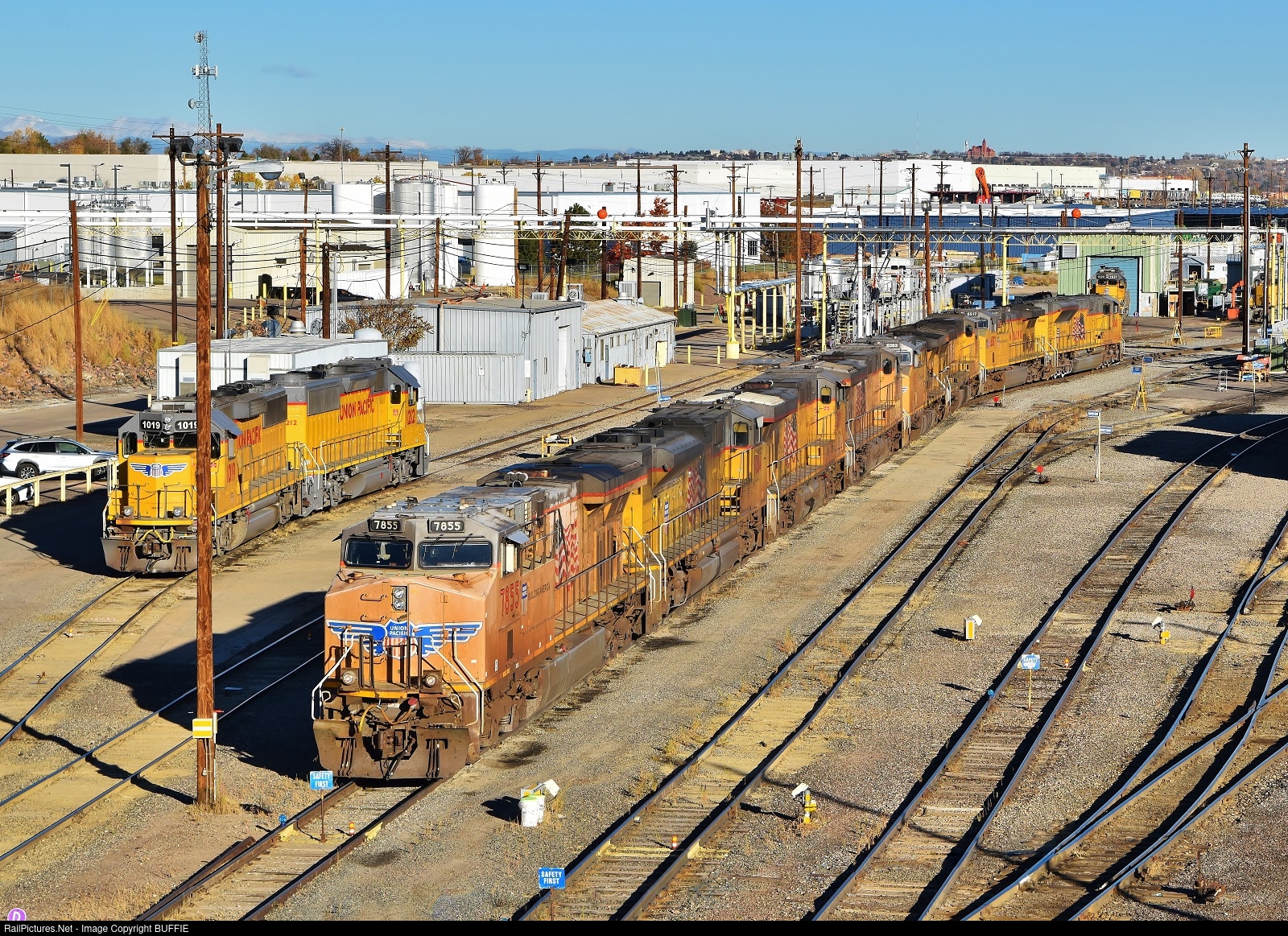 | UP 7855 (ES44AC) joins a line of other heavies as they wait for service in the North Yard in Denver, Colorado.