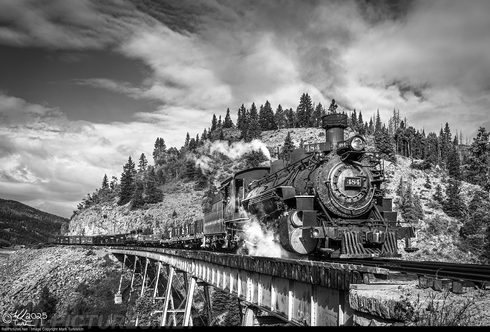 Denver & Rio Grande Western 484 crosses Cascade Trestle with its freight train on a sunny summer morning.