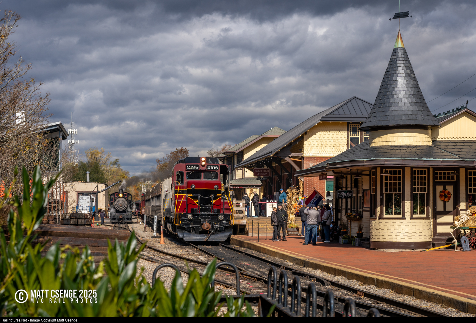 Popular Passenger Service. The scene at New Hope Station is briefly sunlit amidst dense clouds on the first day of November 2025. Front and center is GP30 no. 2198, idling on the station track as passengers board their fall foliage excursion. In the background is 2-8-0 locomotive 40, topping up on water prior to its next run.