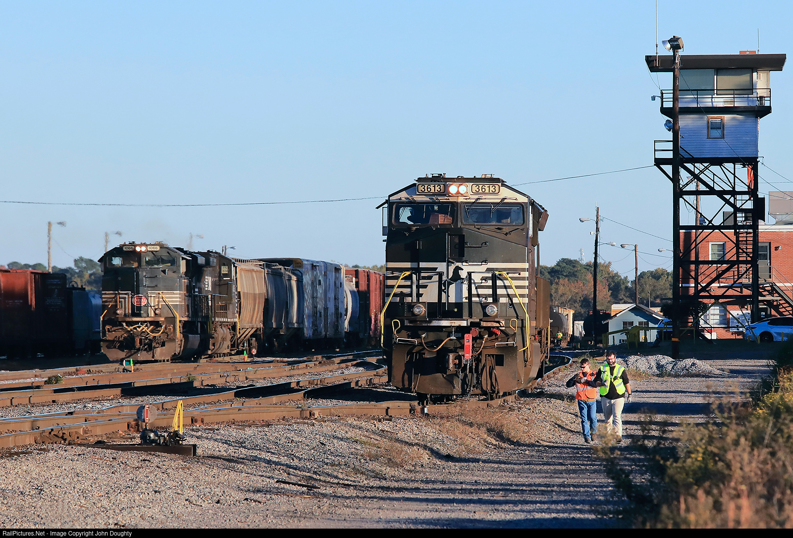 | Crewmembers on the NS 3613 walk down to throw the switch so the engineer can move the engine and then back it down the yard to be placed as a DPU in a train. To the left, the NS 1066 New York Central Heritage unit puts together its train to take north later in the evening. Canon 5D Mark IV. |