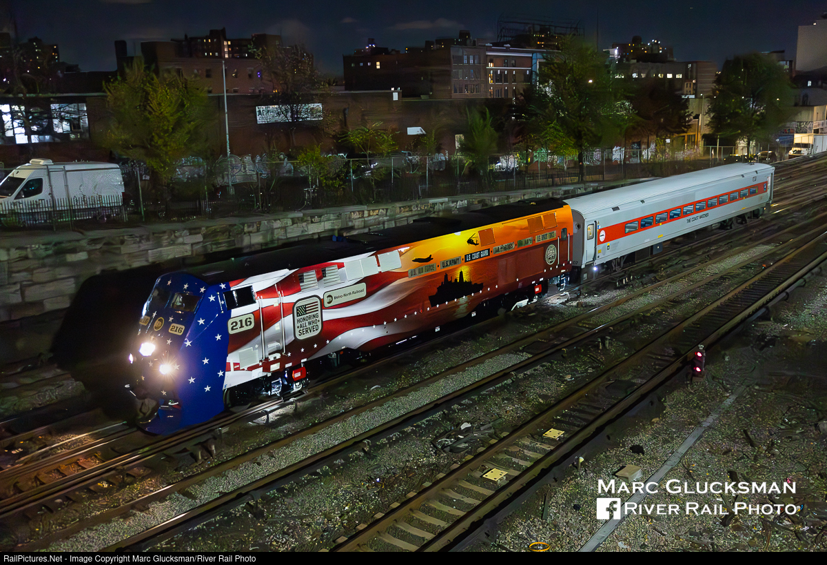 MTA Metro-North Railroad's Veterans Unit On The Move. On November 10, 2025, MTA Metro-North Railroad unveiled recently overhauled MNCW P32AC-DM 216 in a new veterans wrap at its North White Plains Yard. The design of the wrap includes embroidered name tapes with the names of all six branches of the United States Military on the background of a mural of military vehicles. Towards the front of the locomotive, it transitions to the stars and stripes of the flag of the United States. The locomotive is the eighth in the "Metro-North Heritage Fleet" series, honoring the 40th Anniversary of MNR's creation in 1983. The locomotive was on display for the public on November 11 & 12, 2025, in Grand Central Terminal (GCT), and is planned to be on display at various employee facilities before entering revenue service next week. The locomotive is seen here with a single cab car passing through the Mott Haven section of the Bronx, New York, on the night of November 12, 2025, moving from GCT to Stamford, Connecticut.