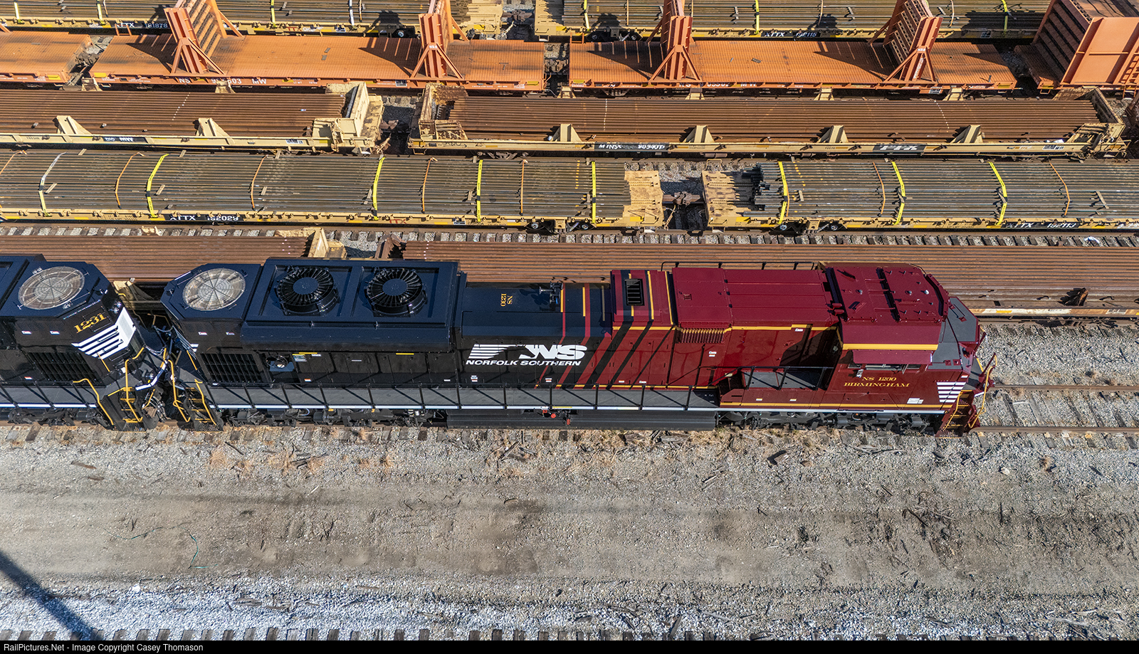 The newest NS paint scheme is half office-car, half freight, as seen here on SD70IAC 1230, the "Birmingham". These units are planned to be power for the office car specials when needed, but will also run in general freight service.