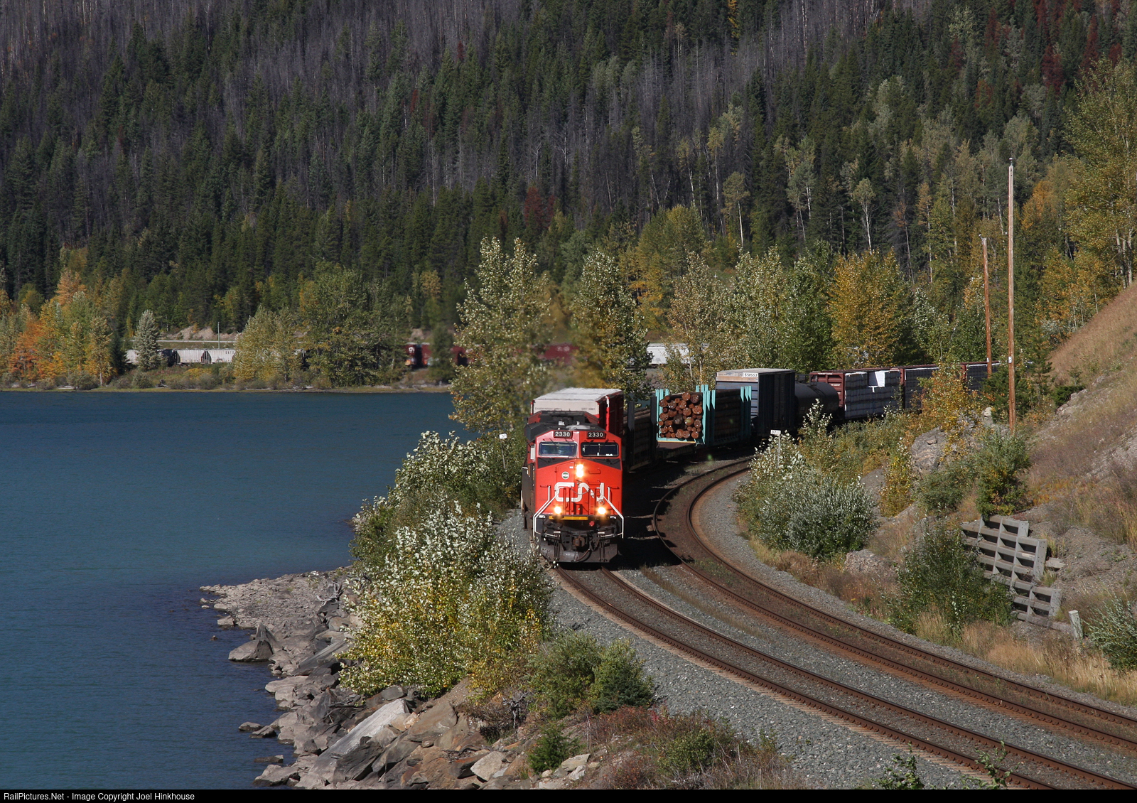 | A great spot to see trains is along Moose Lake, just near British Columbia's eastern border with Alberta, perhaps 35 miles ... excuse me, 57 kilometers ... from Jasper. |
