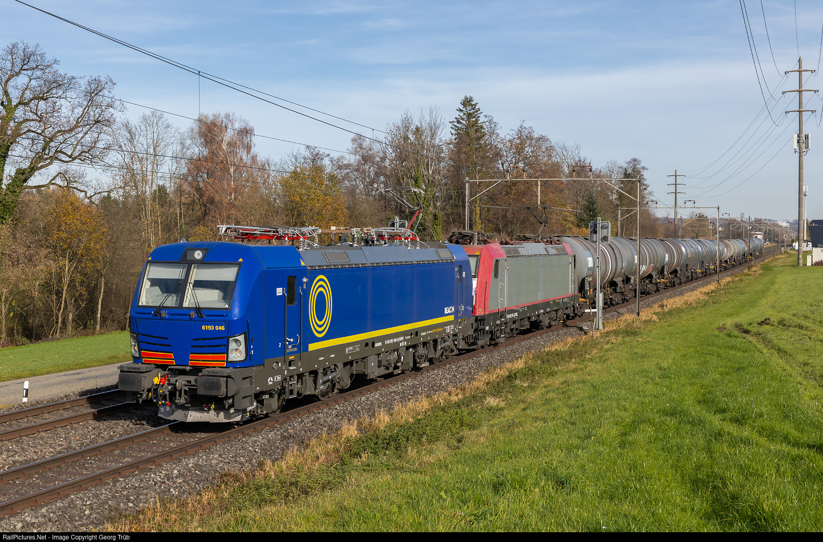 Siemens "Vectron" 6193 # 046 (91 80 6193 046-2 D-DISPO) of the Beacon Rail Leasing (Beacon Rail Capital Europe GmbH, München) and Bombardier TRAXX F140 AC2 185 # 591 of Beacon Rail Leasing (91 80 6185 591-5 D-BRLL) in multiple control, rented to LTE, pull the loaded fuel oil tank car train 69648 from (Austria-) Buchs via Rorschach-Romanshorn VL-Weinfelden to Bettwiesen (Tägerschen fuel depot), between Erlen and Sulgen.
