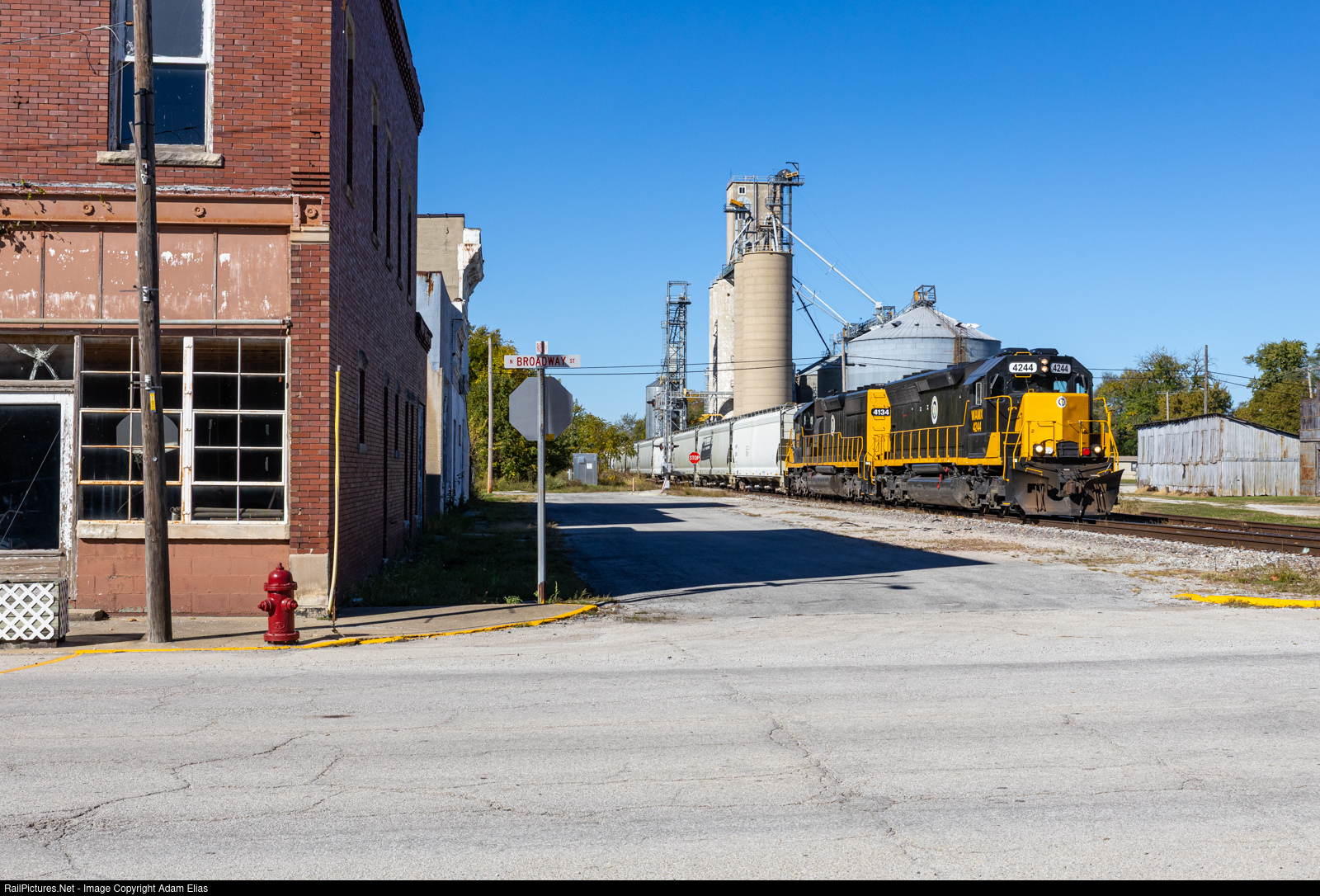 | DREI 101 making their way East through downtown Newman, Illinois. The old brick buildings downtown here are super neat. |