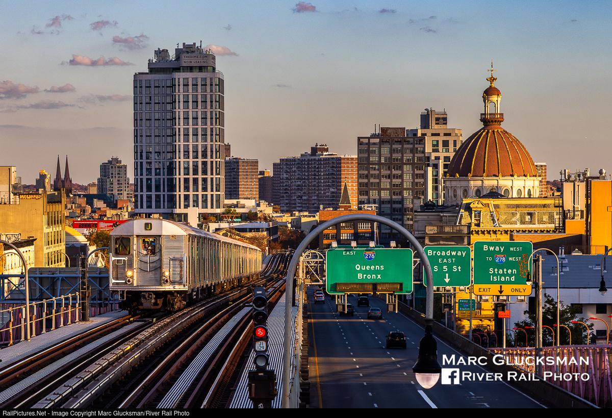 New York Transit Museum Excursion With Budd R32s: Celebrating The Brightliners. On November 8, 2025, the New York Transit Museum (NYTM) operated a pair of ticketed "Celebrating The Brightliners" excursions, celebrating the 61st Anniversary of the debut of the Budd R32 cars. Both trips brought passengers round-trip between 96 Street/2 Avenue on the Q Line to Crescent Street on the J Line. The train changed ends at the siding near Crescent Street, and was routed via a through track in the East New York Yard, giving attendees a rare opportunity to travel over these normally non-revenue tracks. The train is seen traveling up the grade on the Williamsburg Bridge in Brooklyn, New York towards Manhattan.