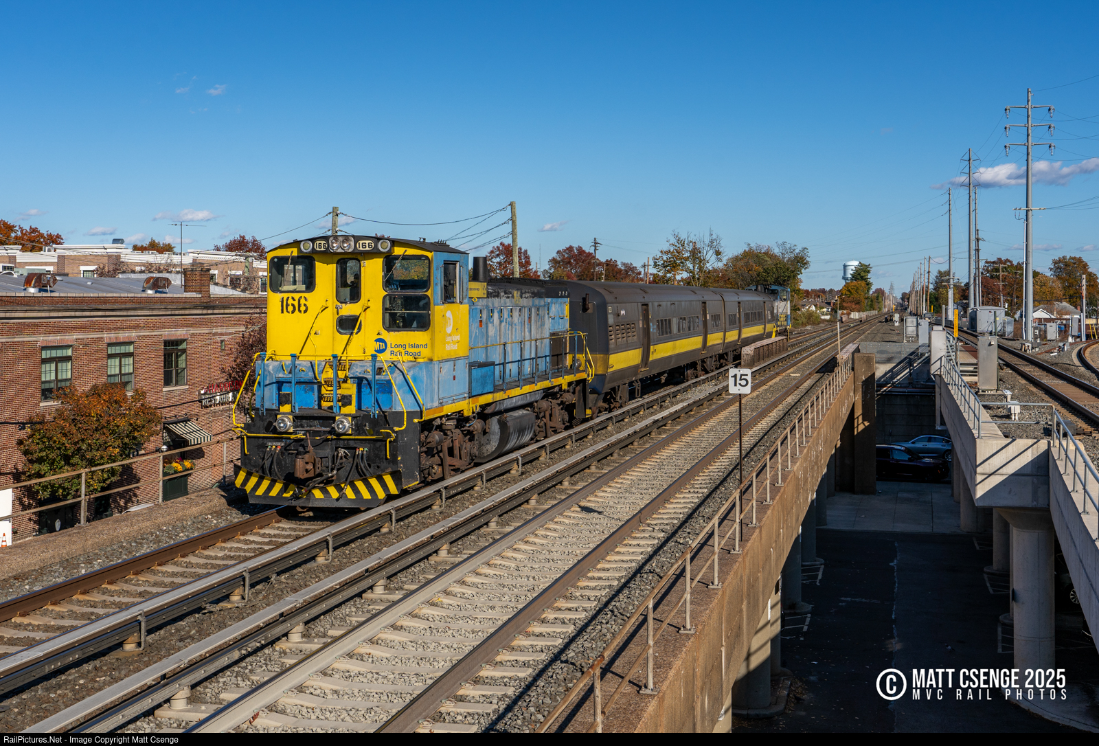 Hit Me With Those Laser Beams! Long Island Rail Road (LIRR) MP15AC no. 166 leads the rail road's laser train towards Floral Park Station, en-route to Queens Village. Two retired Budd M3 cars - numbered E901 and E902 - were converted for this seasonal service, cleaning the rails of slimy, slippery residue from crushed leaves. Locomotive 158 brings up the rear of the train, allowing for quick turnarounds when changing direction.