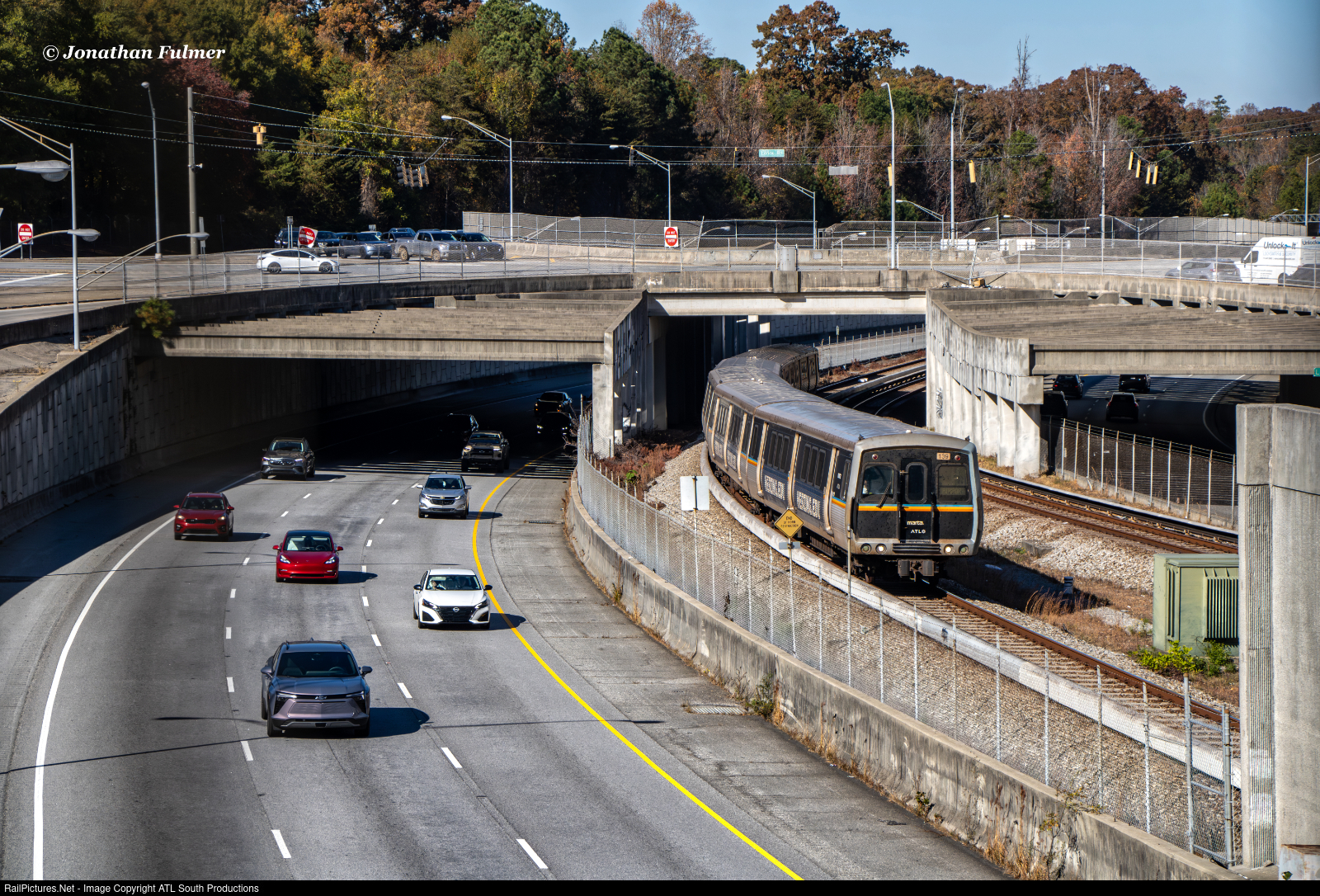| "Racing into Hot'lanta" As midday traffic rolls in and out of Atlanta on State Route 400, the 1:27 PM southbound MARTA Red Line train arrives for its station stop at Buckhead as it continues into the heart of downtown Atlanta. While not as major as the sections operated by the CTA in Chicago, MARTA has a 7.5 mile section between Sandy Springs and Buckhead where MARTA splits State Route 400. Figured to try something different with this shot, honestly like how it came out. |