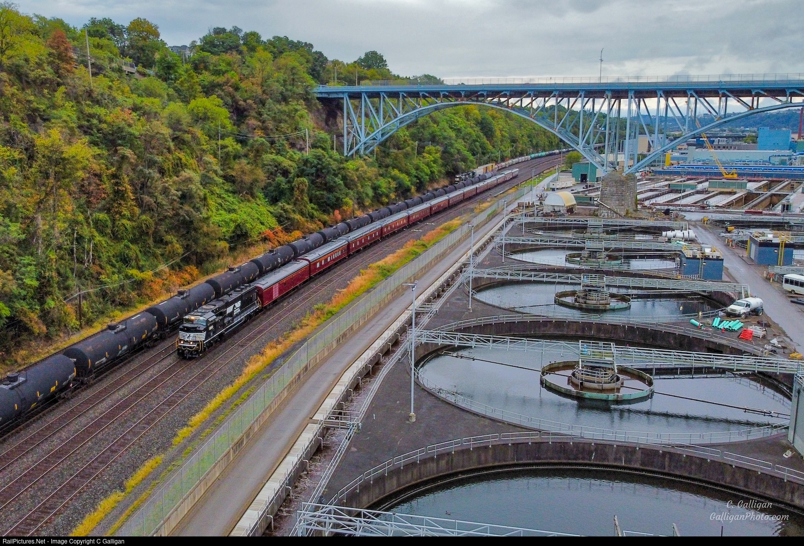 Norfolk Southern Office Car Special 955 has departed from Pittsburgh, passing under the McKees Rocks Bridge enroute to Chicago.