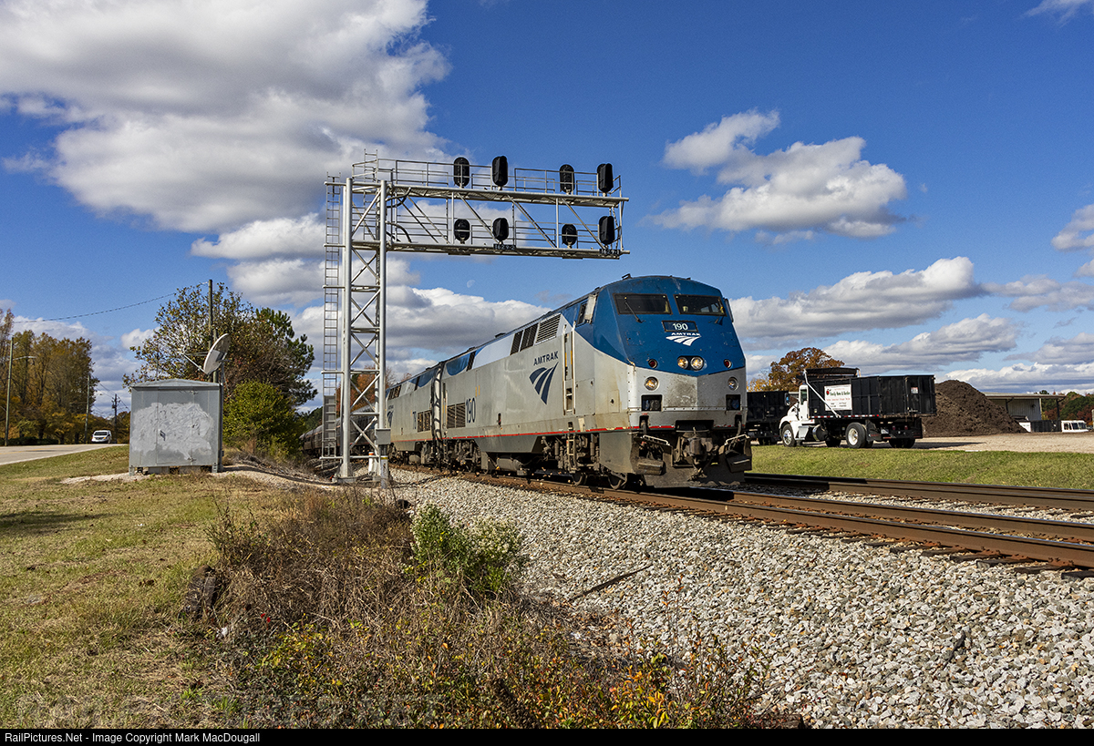 | Amtrak 40 passes the "Ole Time BBQ" intermediate signal (nicknamed for the adjacent establishment) on the double track between Cary and Raleigh with back to back P42s leading the way. |