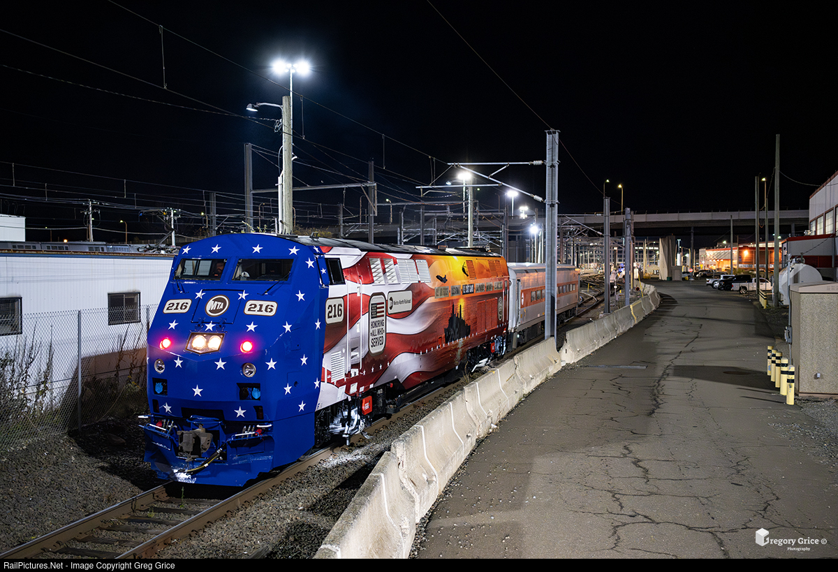 Metro-North's 40th Anniversary "Honoring All Who Served" Veterans-wrapped P32AC-DM, MNCW 216, powers deadhead train 5588 on Track 41 at New Haven Yard in Connecticut on November 13th, 2025.