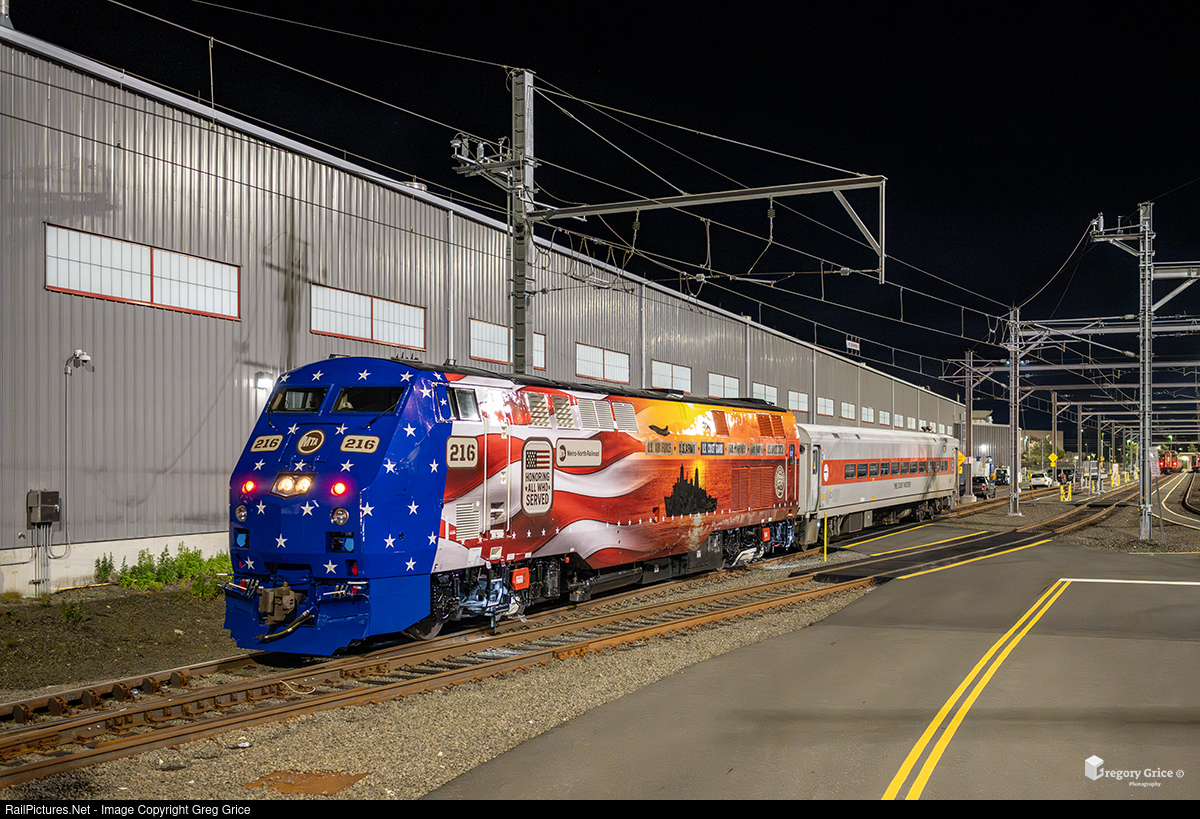 Metro-North's 40th Anniversary "Honoring All Who Served" Veterans-wrapped P32AC-DM, MNCW 216, powers deadhead train 5588 on past the Running Repair Shop on Track 44 at New Haven Yard in Connecticut on November 13th, 2025.