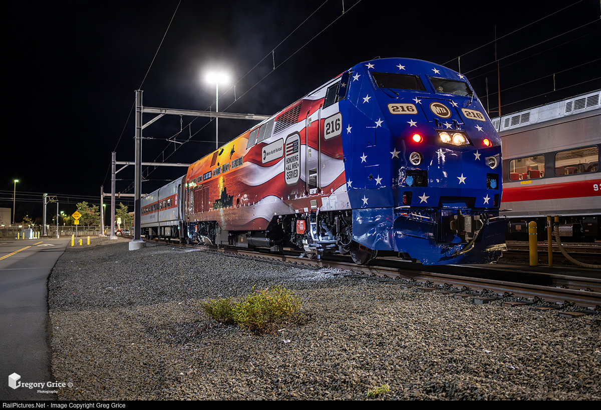 Metro-North's 40th Anniversary "Honoring All Who Served" Veterans-wrapped P32AC-DM, MNCW 216, idles on Track 44 at New Haven Yard in Connecticut on November 13th, 2025.