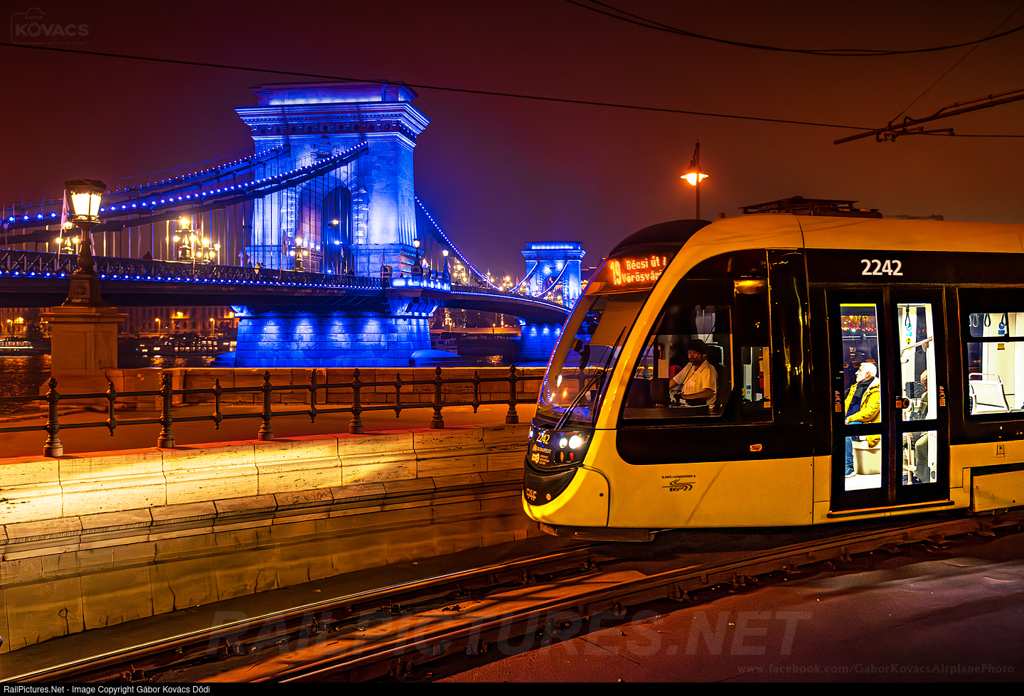 Budapest tram with the city's most beautiful bridge, the Chain Bridge, in the background.