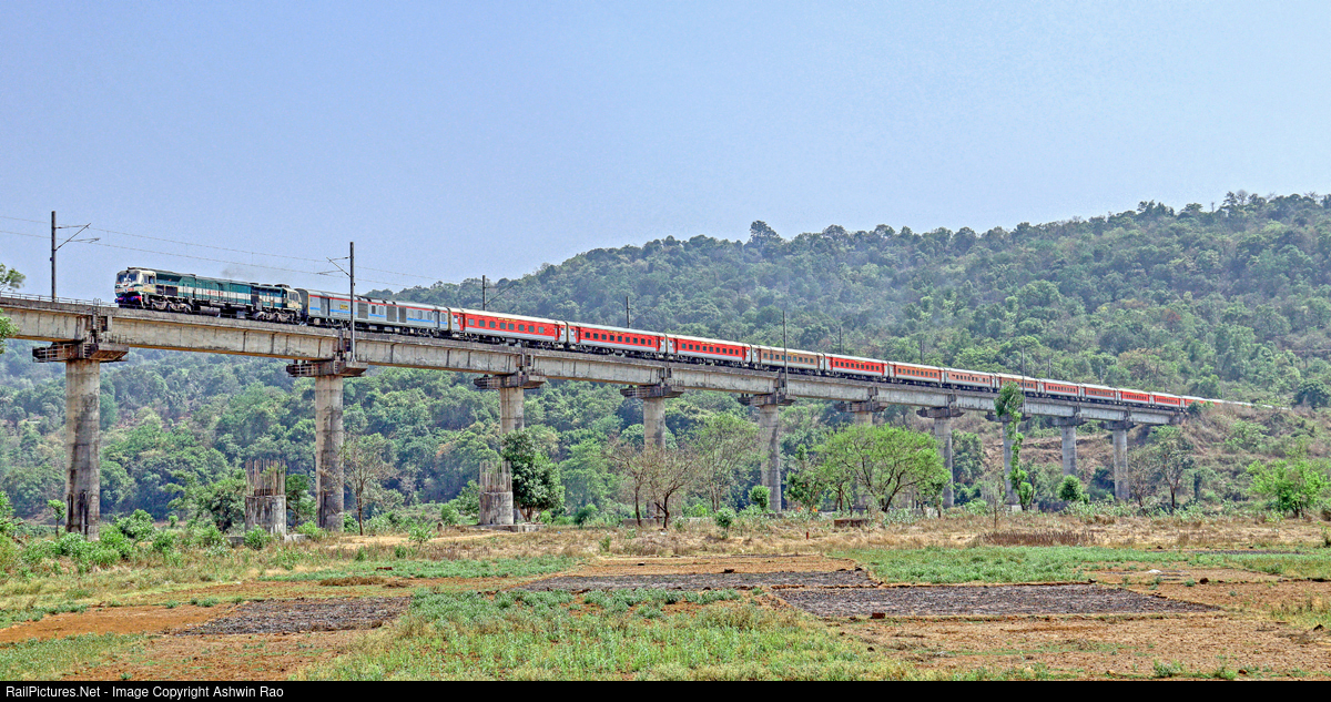 WDP4D hauled Thiruvananthapuram Hazrat Nizamuddin Rajdhani (longest running Rajdhani in India covering a distance of 3144 Kms) at Shastri river bridge near Sangameshwar. Ratnagiri, Konkan Railways.