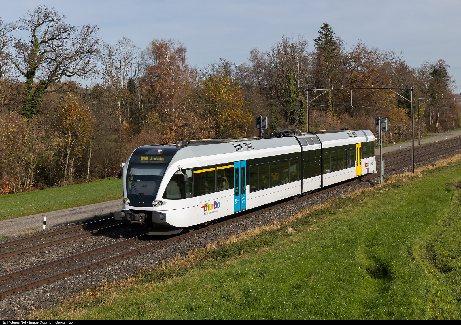 | Short articulated lowfloor regional train "AK" (automatic coupler) RABe 526 # 743 of the Thurbo is running the S7 service 11744 from Rorschach via Romanshorn to Weinfelden, between Erlen and Sulgen. |