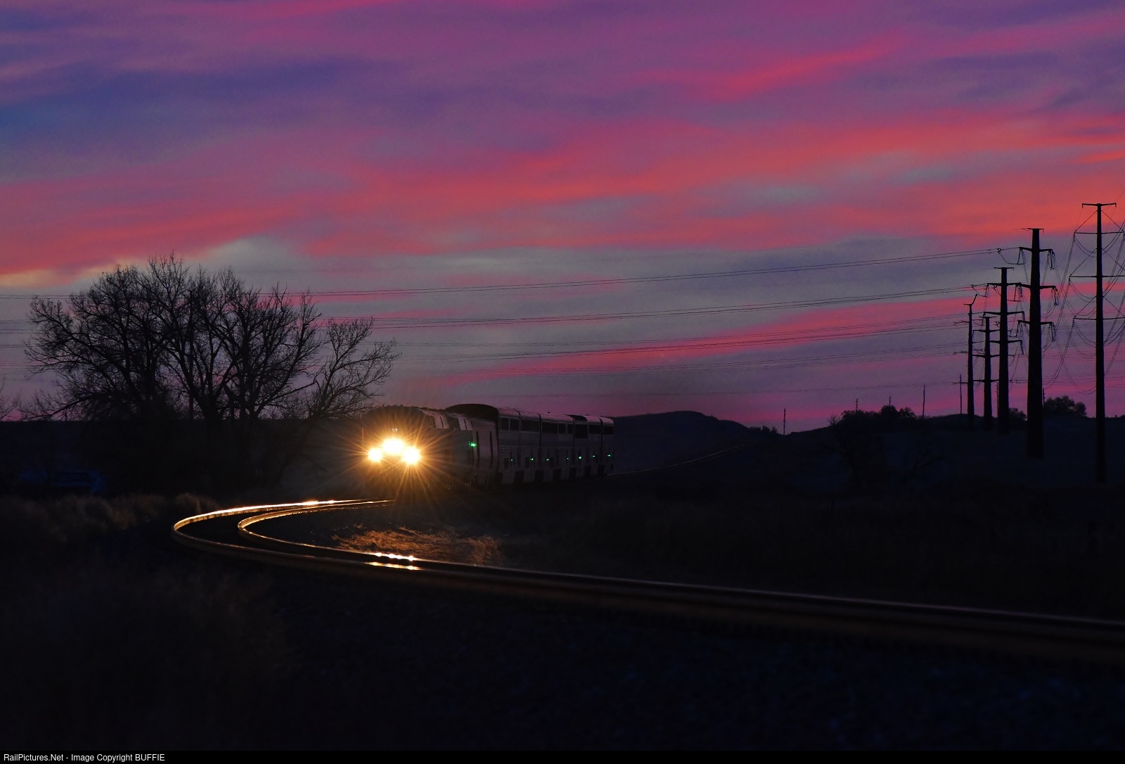 | A cotton-candy sunrise greets the passengers and crew of the California Zephyr as it runs through Keenesburg, Colorado on its way to Denver.