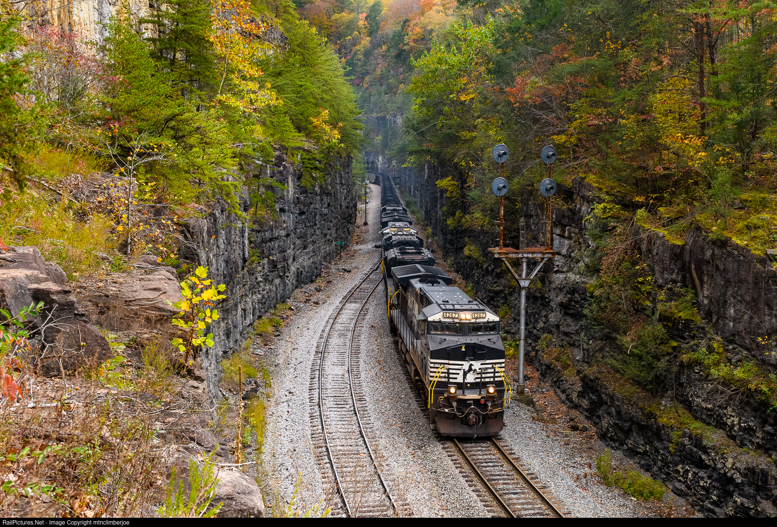 | With four units on the head end, Norfolk Southern loaded coal train 80E heads west on the Guyandot River Branch and passes the Virginian searchlight signals guarding the control point at Lincoln, West Virginia. This control point is located deep within one of the rock cuts blasted through the mountains when this section of the line was relocated for the construction of the R. D. Bailey dam project in the late 1960's and early 1970's. |