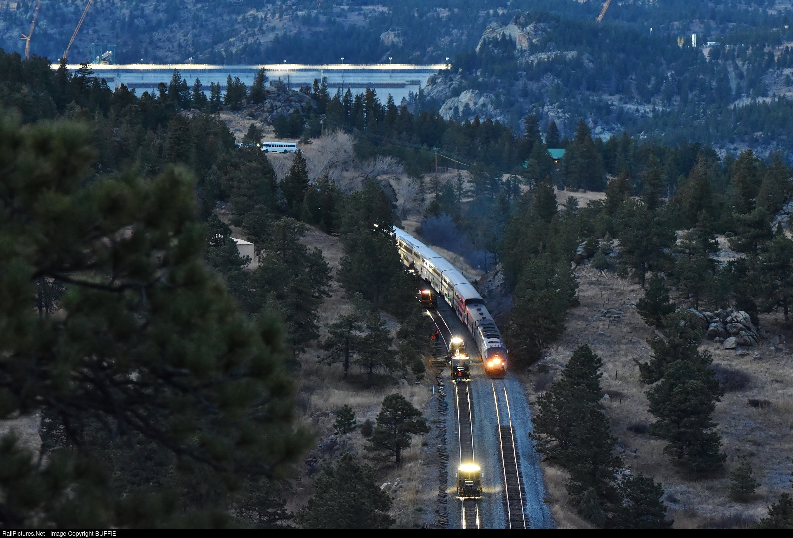 | The California Zephyr #6 train runs through Crescent, Colorado at sunset, carful to pass the many maintenance critters that are working on replacing the ties and plates on the main line. |