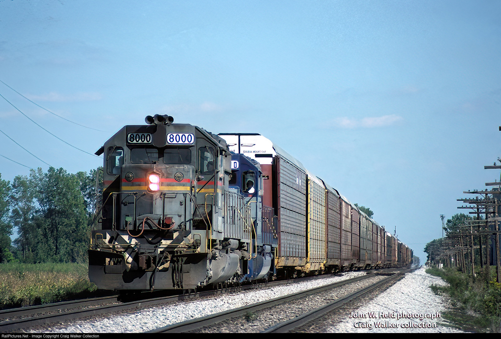 CSX Transportation SD40-2 8000 (ex-SBD 8000; née-L&N 8000) and GP40 6610 (ex-B&O 4035) lead a vehicle train in Fostoria, Ohio. (September 14, 1988).