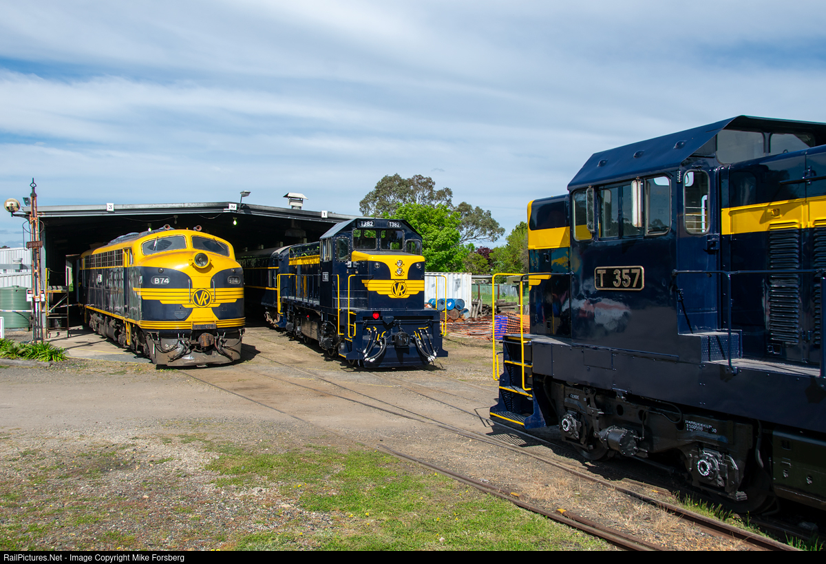 | T357 in fresh paint shunts at Seymour Railway Heritage Centre as B74 and T382 (also in fresh paint) watch on. |
