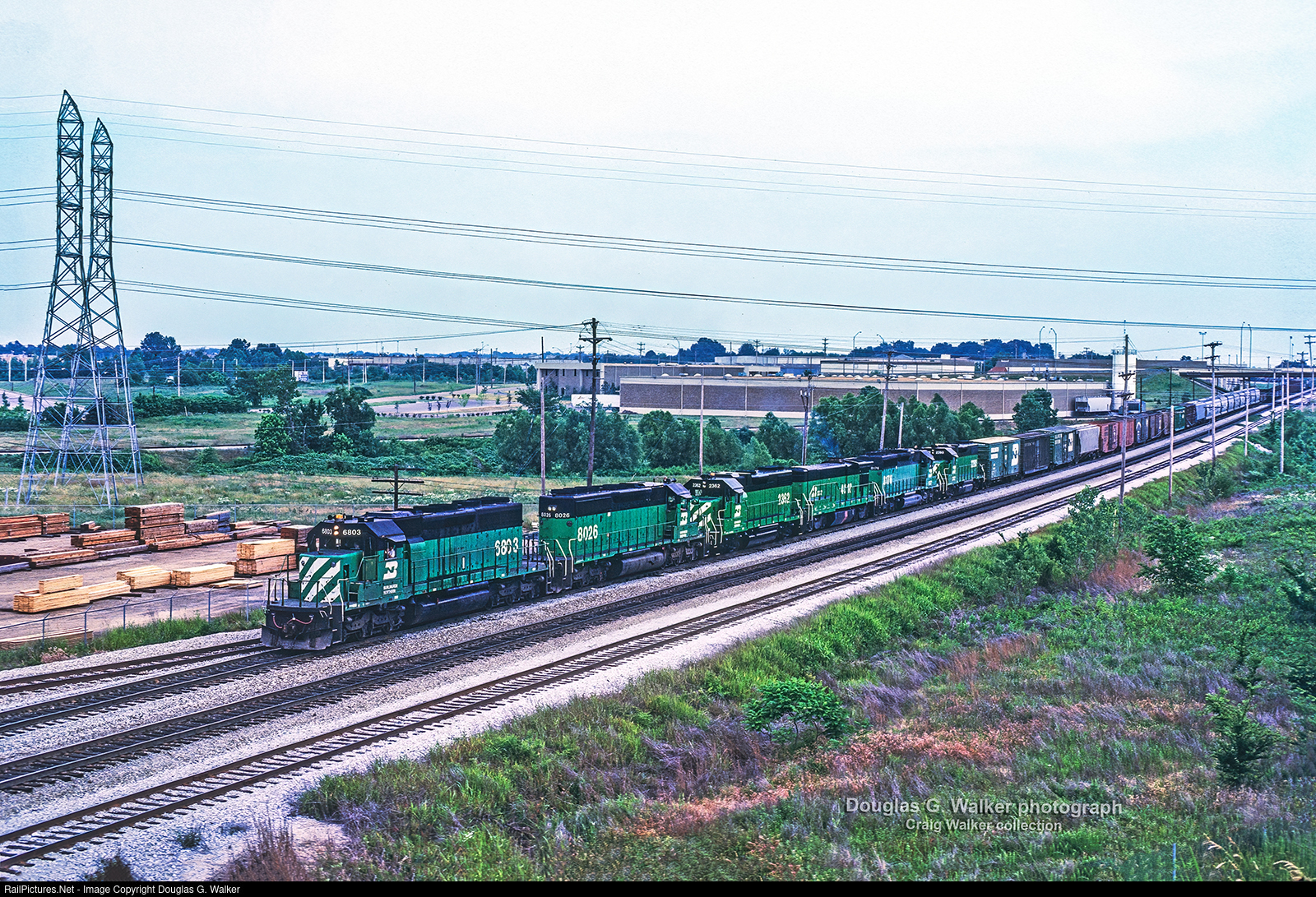 This Burlington Northern Railway freight train has a healthy set of power up front: SD40-2 6803 (ex-BN 6343), SD40-2 8026, GP38-2 2362 (ex-SLSF 692), B30-7A(B) 4018, SD40-2 8176 and GP38-2 2280 (ex-SLSF 425). BN 6803 was one of a group of BN SD40-2s that were testing Locotrol on the Southern Pacific in southern California for a few years in the 1970s.