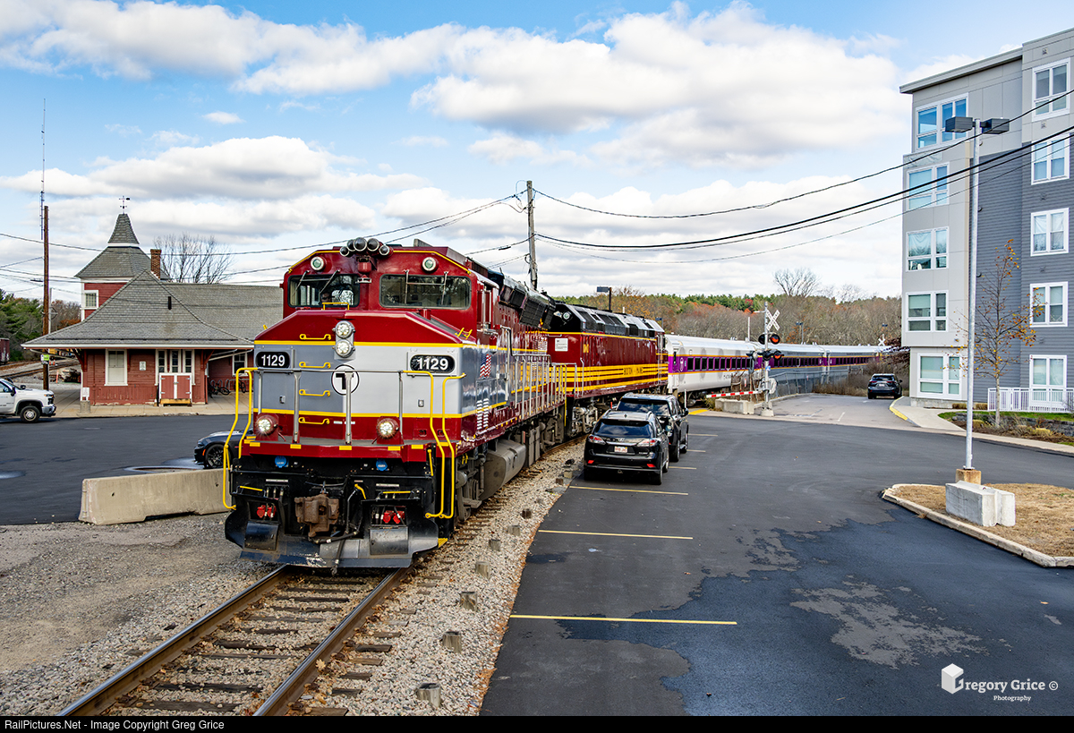 As clouds roll in on the morning of November 14th, 2025, the MBTA/Keolis “Seaview Extra,” led by EMD GP40MC-3 MBTX 1129 in B&M “Cranberry” paint, cuts through the station parking lot at Walpole, Massachusetts, as it leaves the Franklin Branch and enters the Framingham Secondary on the way to Foxboro. This special move marked the inaugural run of MBTA’s new Office Car Special consist, which features four overhauled MBB CTC/BTC-3 coaches, including “The Mayflower,” an observation car with a full glass end.