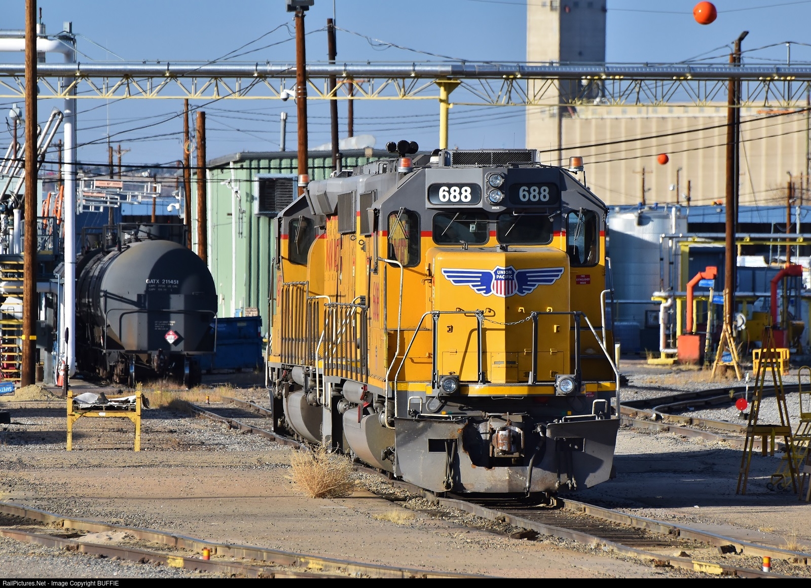 | UP 688 (GP38-2) waits for the call to action to head into the North Yard in downtown Denver, Colorado to sort freight cars.