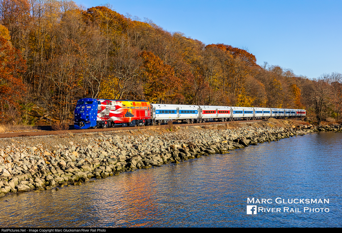 Veterans In Service. On November 10, 2025, MTA Metro-North Railroad unveiled recently overhauled MNCW P32AC-DM 216 in a new veterans wrap at its North White Plains Yard. The design of the wrap includes embroidered name tapes with the names of all six branches of the United States Military on the background of a mural of military vehicles. Towards the front of the locomotive, it transitions to the stars and stripes of the flag of the United States. The locomotive is the eighth in the "Metro-North Heritage Fleet" series, honoring the 40th Anniversary of MNR's creation in 1983. The locomotive was on display at various locations throughout the system for a week, allowing people to see it up close. After entering revenue service the prior day, on the afternoon of Thursday, November 20, 2025, it made its first northbound trip on the Hudson Line on Train 833. The train is seen next to the Hudson River crossing Oscawana Island in Croton-On-Hudson, New York, en route from Grand Central Terminal to Poughkeepsie, New York, with the last remnants of seasonal color hanging on the trees.
