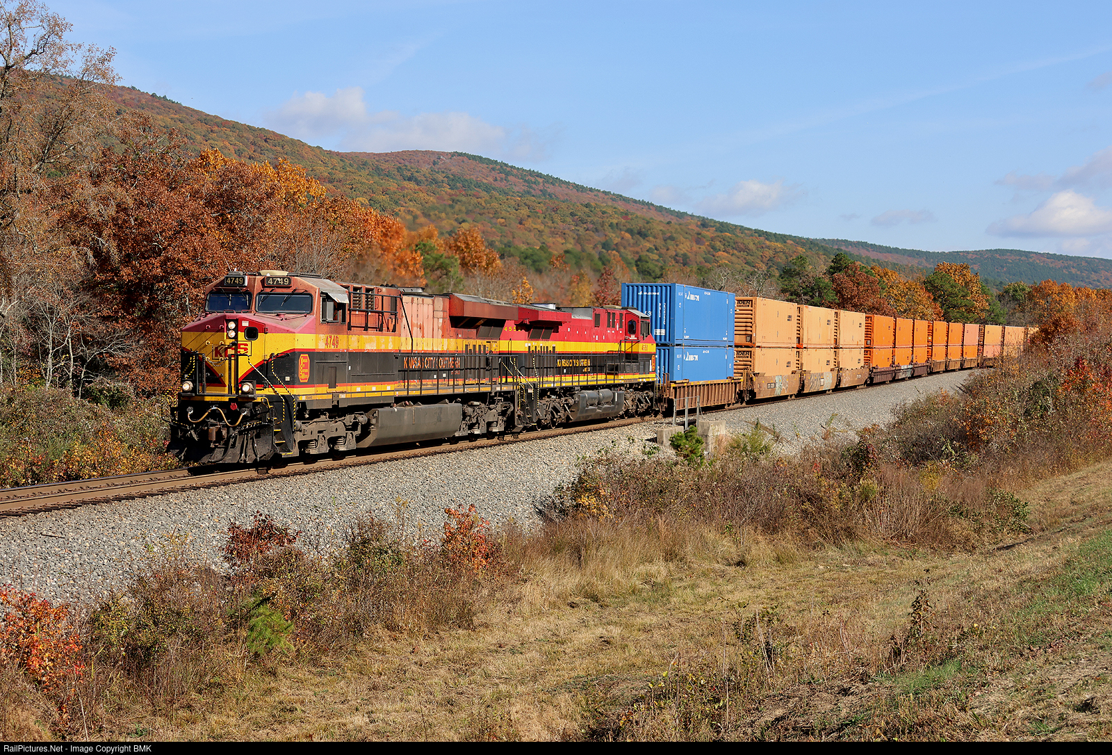 KCSM 4749 leads the hottest train on the railroad through Rich Mountain and beautiful fall color on its way to Bensenville Yard just outside of Chicago.