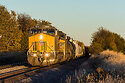 A rebuilt C44-9W leads a mixed freight into the setting sun.
