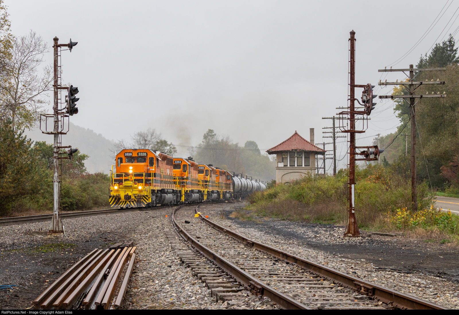 | A four pack of company painted SD40s lead X-RISI towards Buffalo on the Buffalo & Pittsburgh. This trackage doesn’t see a daylight train too often so this was a really nice shot to bag while out here on a trip. This tower is a former B&O tower that was built in 1913 and remained in service until the 1960s. |