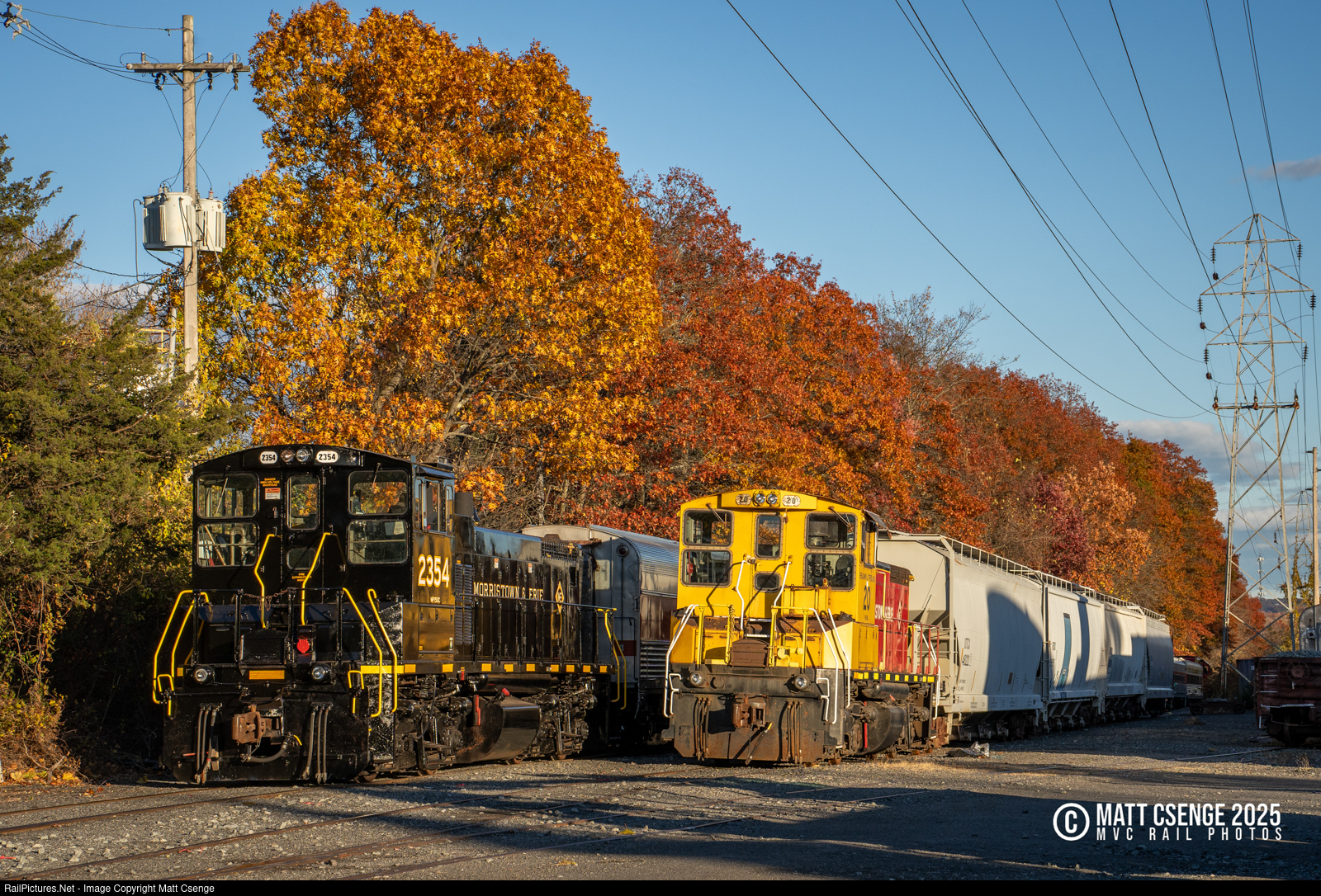 Morristown & Erie Railway (ME) SW1500 no. 20 and MP15DC no. 2354 are seen on adjacent tracks at the Troy Hills Bulk Transload Facility. Number 2354 is a newer addition to the railroad's roster, having been won at a Norfolk Southern auction. The unit made its debut at the beginning of 2025 Polar Express operations in a "dip black" version of the M&E's paint scheme. |
