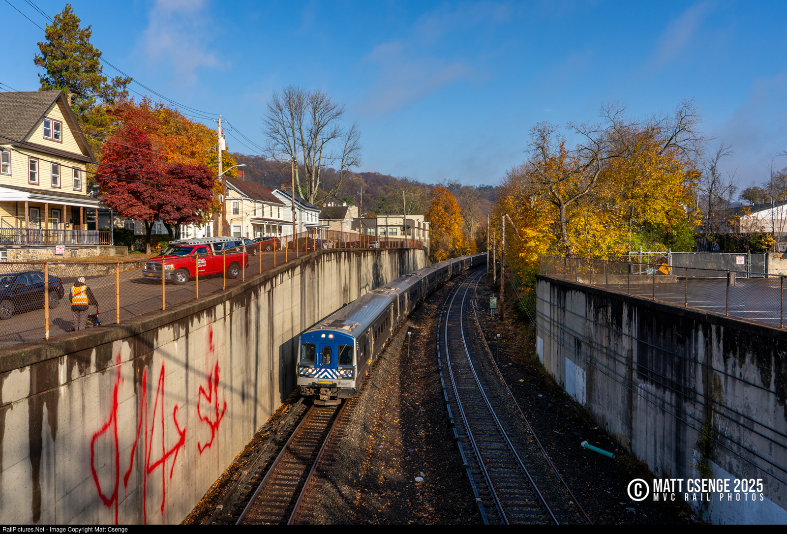 Metro-North Railroad (MNR) M7A car 4061 is the lead unit on a southbound Harlem Line train seen approaching Pleasantville Station, which is set below the grade of the surrounding town following a grade separation project in the 1950s. |
