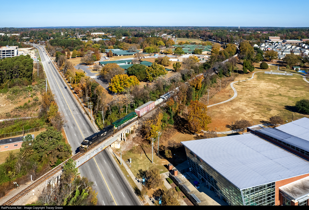 | Just Got Into Town. With the SOU heritage unit trailing second, the daily manifest 15R arrives into town across Harden Street on the Southern's R Line. |