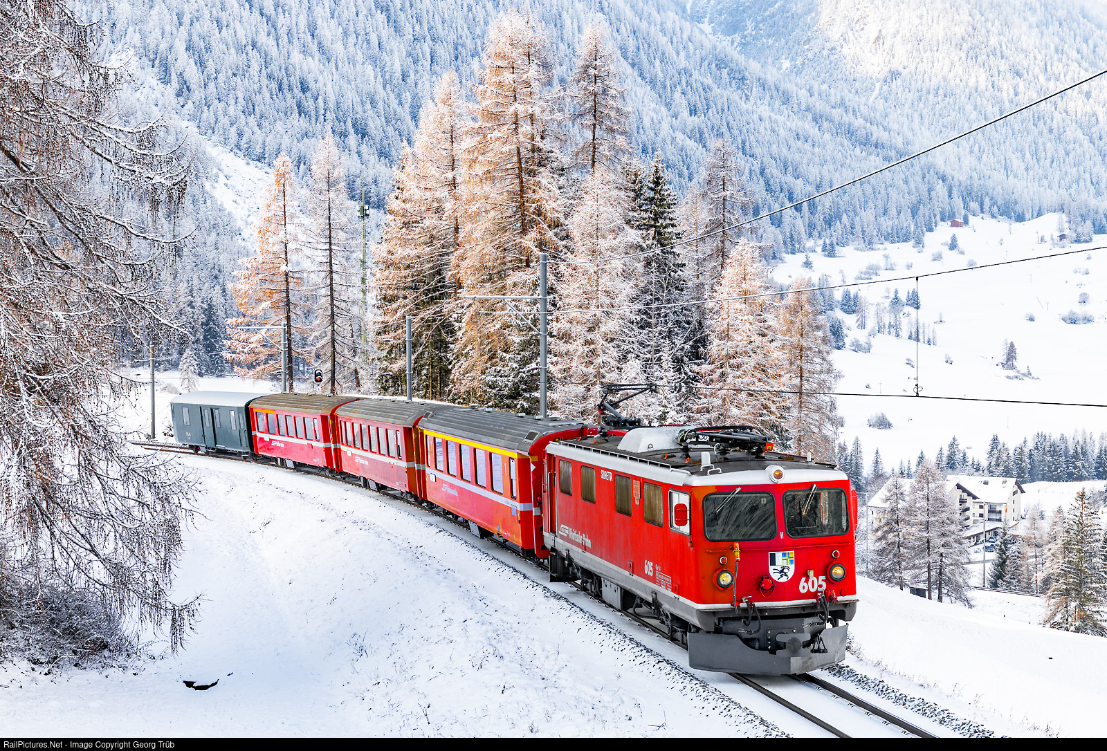 On this day, the Grün und Chrom Foundation, together with the Rhaetian Railway Steam Enthusiasts Association, organized a trip from Chur to Alp Grüm and back. The Ge 4/4 I # 605 pulled the train with four cars, including the green baggage car D # 4205 in the rear, from Chur via the Albula line to Pontresina. The train stopped above Bergün for a short photo session on the open line.