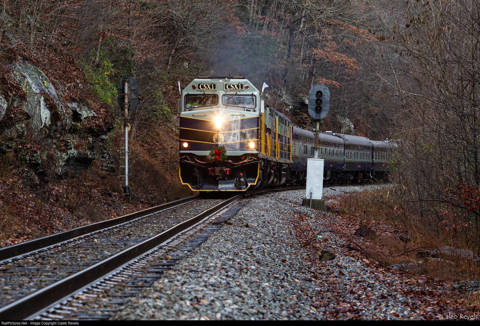 CSXT 1 leads the 83rd Santa Train southbound at Nora Junction, splitting the Clinchfield era US&S intermediates. Nora Junction is where the former CRR Nora Spur splits from the mainline. The Nora Spur was the oldest of the Clinchfield Railroad's branch lines, and was started in 1925 and, after a series of additions and extensions over the years, made it to the Blue Diamond mine by late 1943. It served a number of mines in the area for its entire existence.